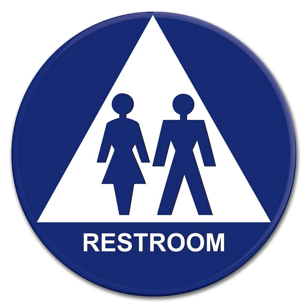 This restroom sign goes on the restroom door. The sign is a triangle on a circular shape. Bold type and contrasting colors for easy readability.
