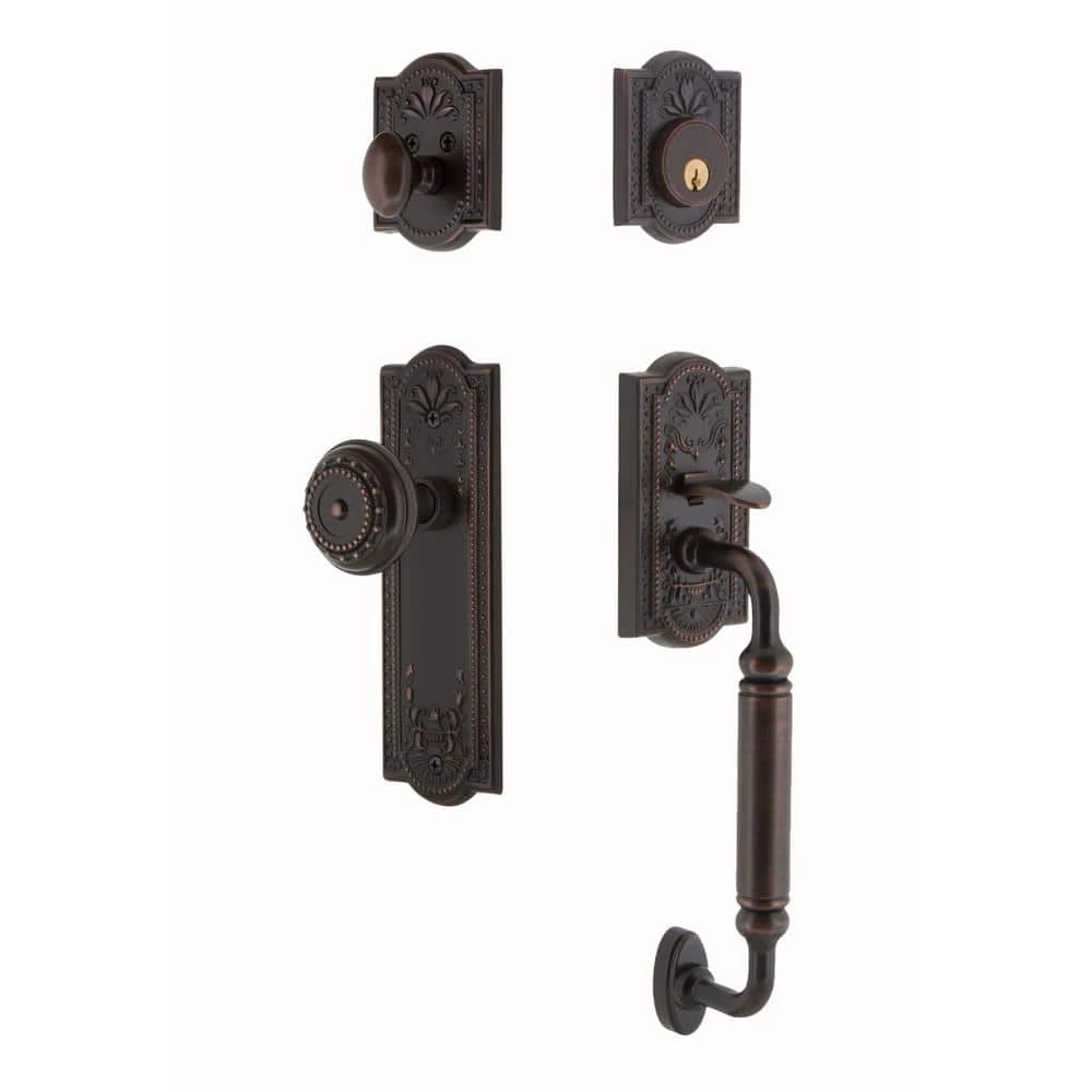 The Meadows Exterior Handleset, with its intricate beaded detailing and botanical flourishes. Creates an inspired design theme. All Nostalgic Warehouse handlesets are mounted on a solid (not plated) forged brass base for durability and beauty.