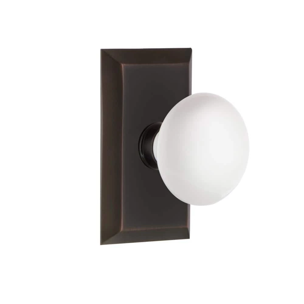 The Studio plate coordinates well with any architectural style, its shorter length is ideal for bedroom or bath but can be used in any room. Add a traditional touch with our pure White Porcelain door knob for a simple, yet vintage, look. All Nostalgic Warehouse door knobs are mounted on a solid (not plated) forged brass base for durability and beauty.