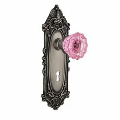 The Victorian Plate, with its distinct curvilinear embellishment, is unmistakably old world vogue. Add our Crystal door knob, with its smooth center flawlessly flowing into fluted edges, for a striking match. All Nostalgic Warehouse door knobs are mounted on a solid (not plated) forged brass base for durability and beauty.